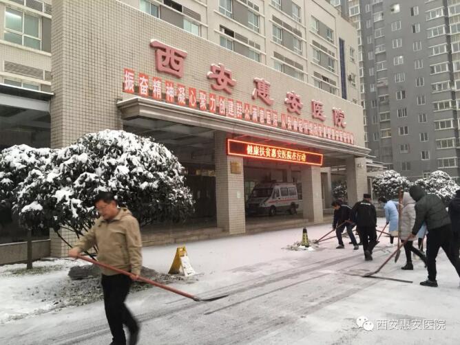 一夜之间,白雪茫茫,2018年的第二场雪,如期而至。厚厚的积雪给大家出行带来了诸多不便,为保证患者来院就诊方便以及急救车安全顺利出行,1月6日,西安惠安医院在院长带领下由院办和后勤保障部组织相关人员在全院和门口道路进行扫雪除冰活动。