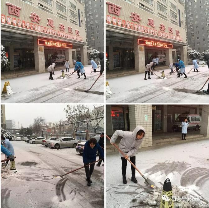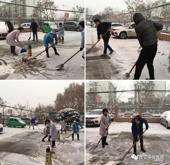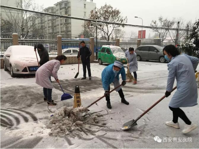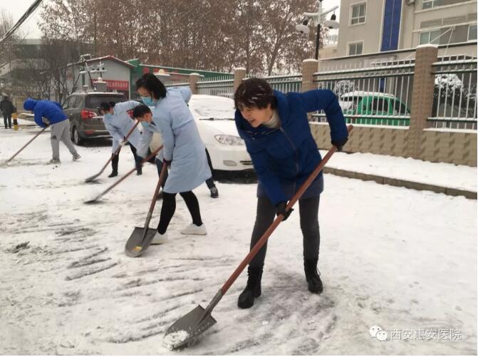 早上8点,大家不畏严寒、冒着大雪来到医院门口,在西安惠安医院院长王志兰、工会主席王海涛及财务总监吴冰的带领下,大家不畏严寒,顶着风雪,挥舞着铁锹、扫帚等工具开始对医院公共区域和门外马路道的积雪进行清扫。大家齐心协力,配合默契,铲的铲、推的推、扫的扫,干的热火朝天,忙碌的身影构成了一道亮丽的风景线。