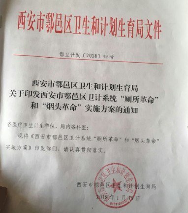 1月20日,鄠邑区卫计局下发了《关于印发西安市鄠邑区卫计系统“厕所革命”和“烟头革命”实施方案的通知》(鄠卫计发〔2018〕49号)文件。为做好医院的环境卫生综合整治工作,营造干净、整洁、优美文明的就医环境,提高医院环境卫生管理水平,西安惠安医院制订了《西安惠安医院关于落实鄠邑区卫计系统“厕所革命”和“烟头革命”实施方案》。