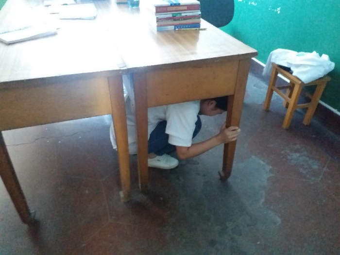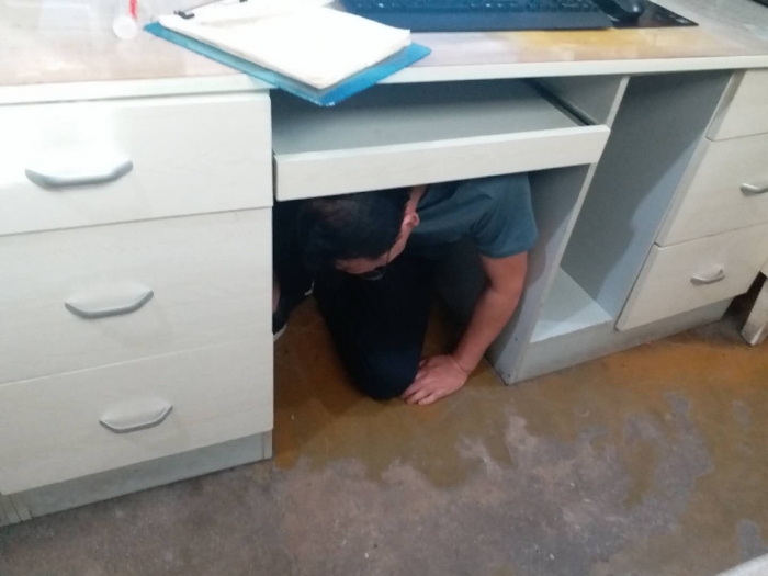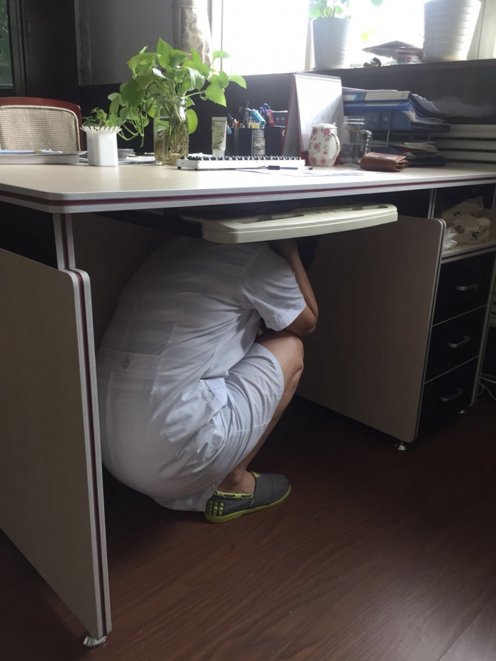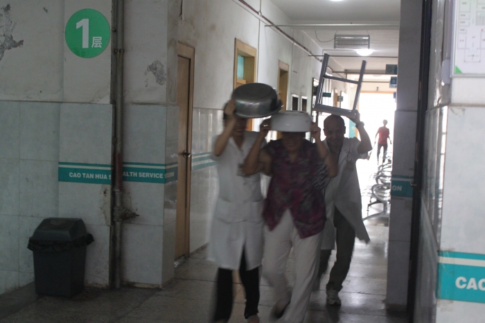 下午4点整,各科室成员都按所定计划正常工作,突然发现桌椅及水杯等物品开始晃动。随着演练总指挥、院长杜生明发出命令(地震了!!!)后,救护车紧急鸣笛,此次应急预案演练开始。看到各科室负责人组织好科室人员和患者不慌不忙,通过判断,果断做出决定,科室人员和患者应以最快的速度钻到最近的桌子或床板下,并用手紧握桌子腿或床支架,行动不便的患者尽量靠近墙角位置。